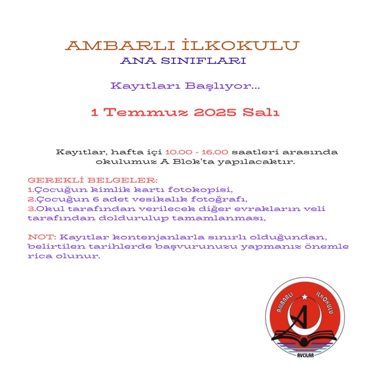 Okulumuz Ana Sınıf ve 1. Sınıf Kesin Kayıtları için velilerimizi hafta içi 10.00 - 16.00 saatleri arasında okulumuza bekliyoruz, saygılarımızla duyurulur...
